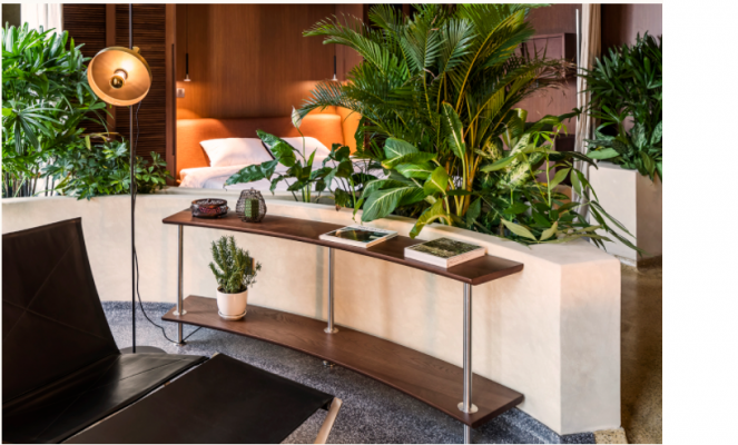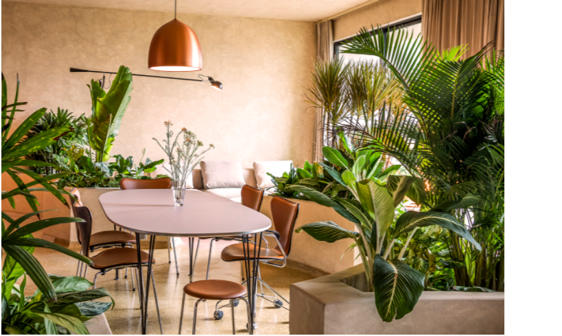 Thay vì tường ngăn, các khu vực chức năng cách nhau bởi những bồn cây trồng các loại thực vật nhiệt đới như cau, cọ, chuối.
